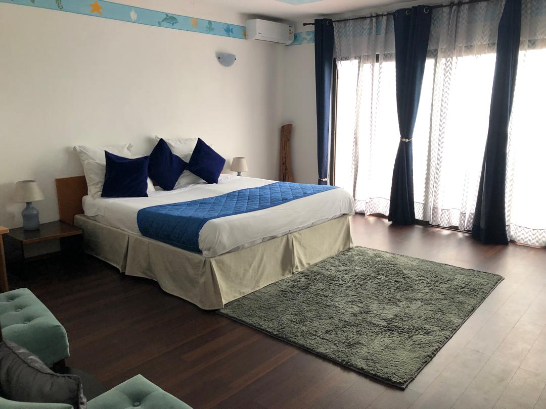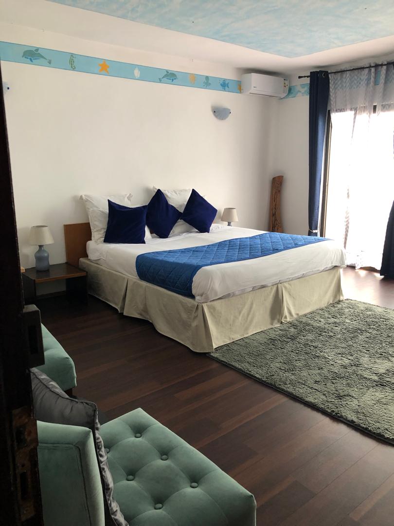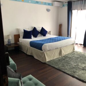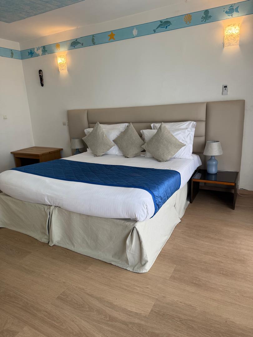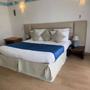 Chambre supérieure vue sur mer avec terrasse privée et baignoire.