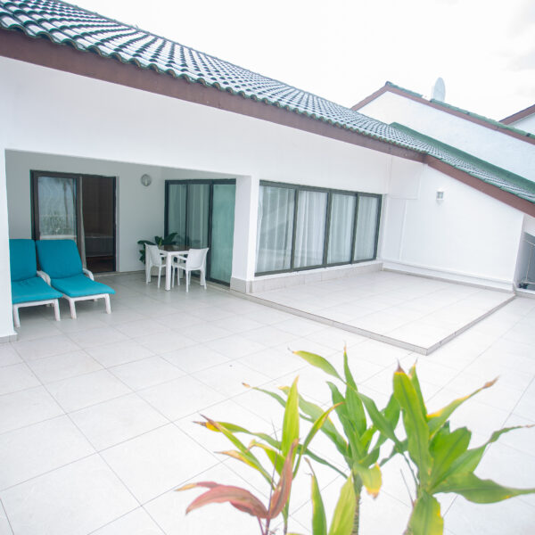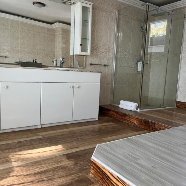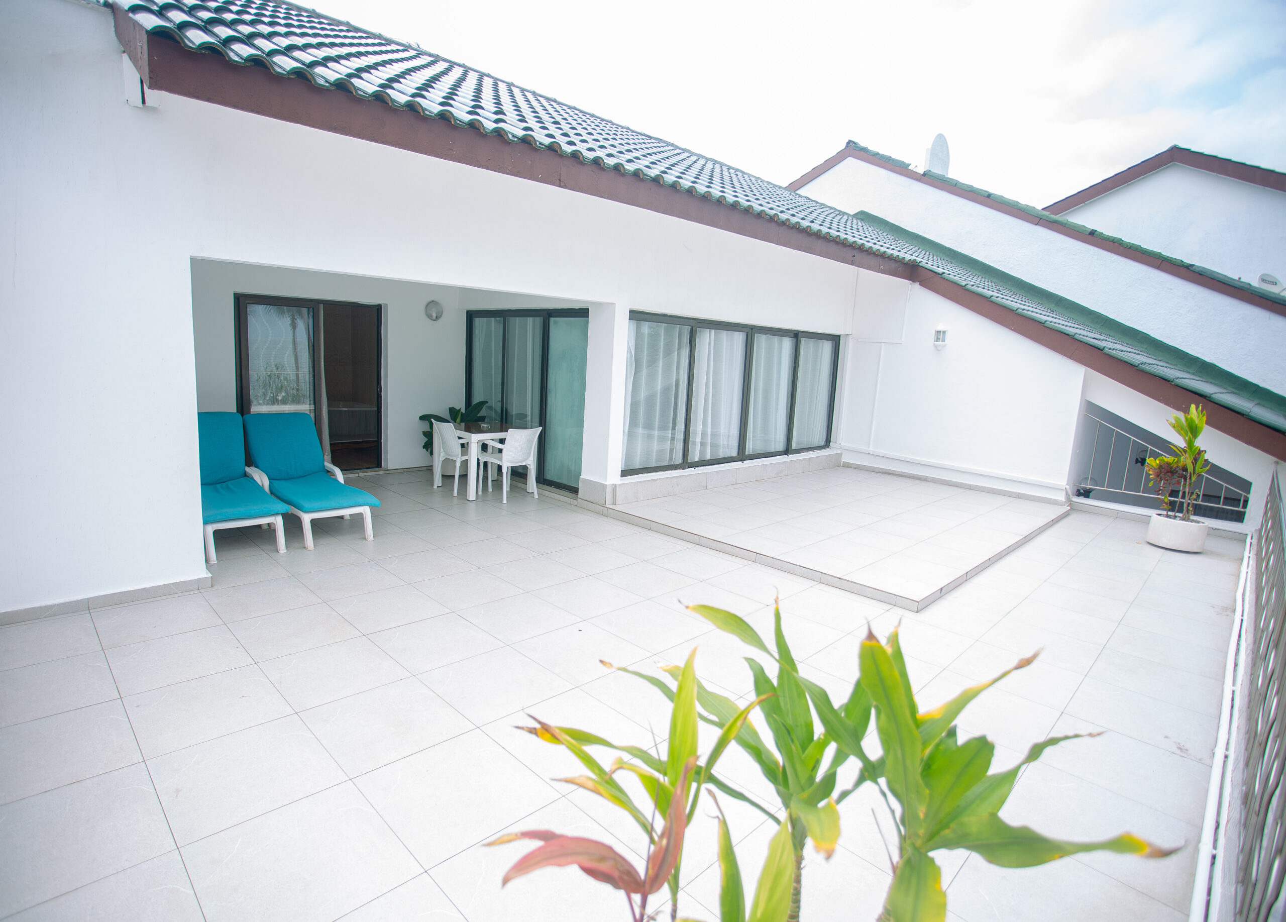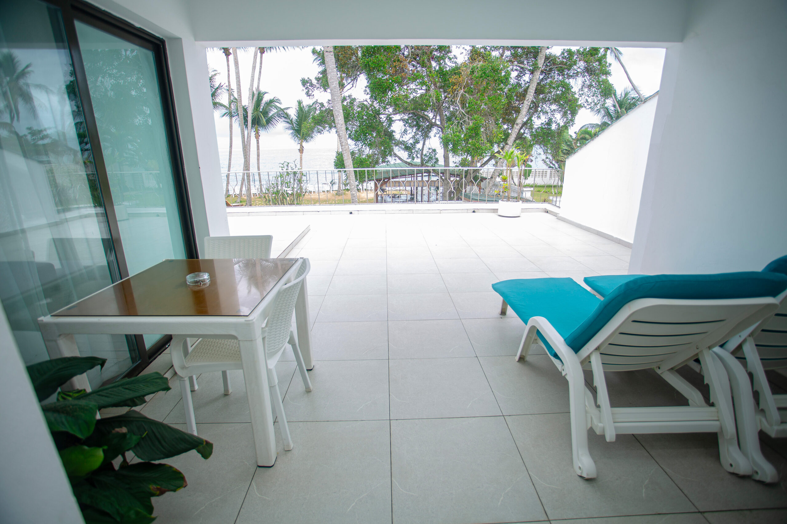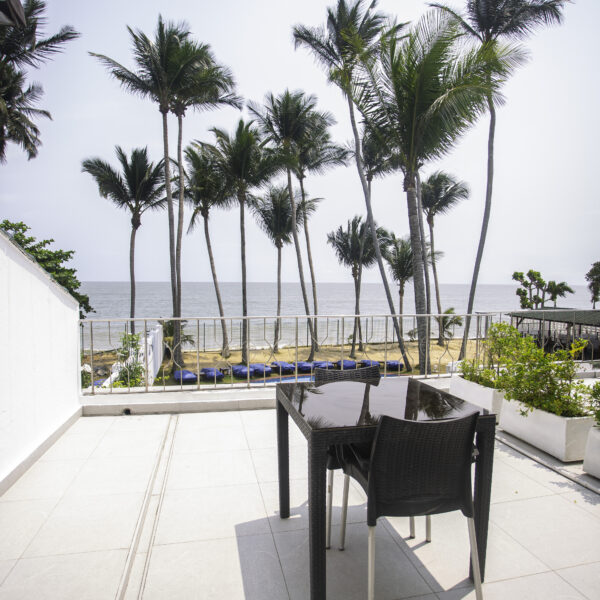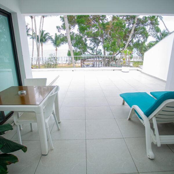 Emplacement magnifique en bord de mer avec 40 mètres carrés d’espace intérieur, situé face à la mer et la piscine, incluant une douche italienne et baignoire.